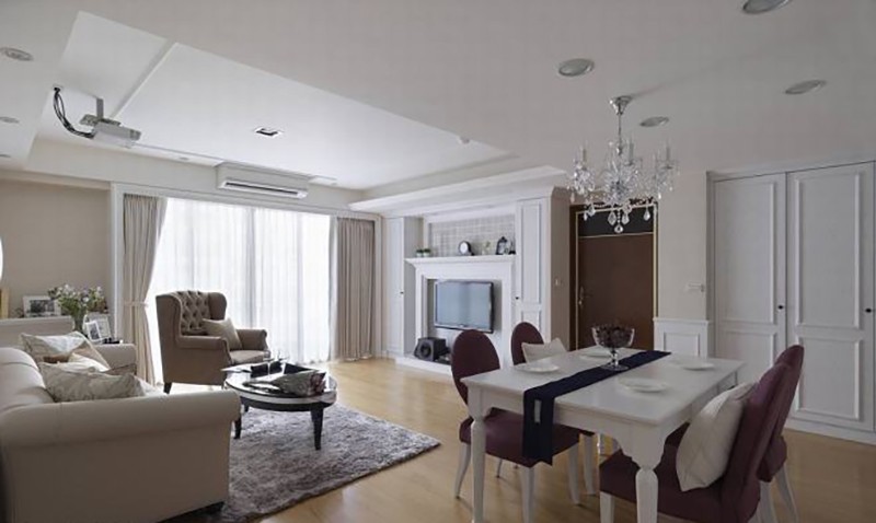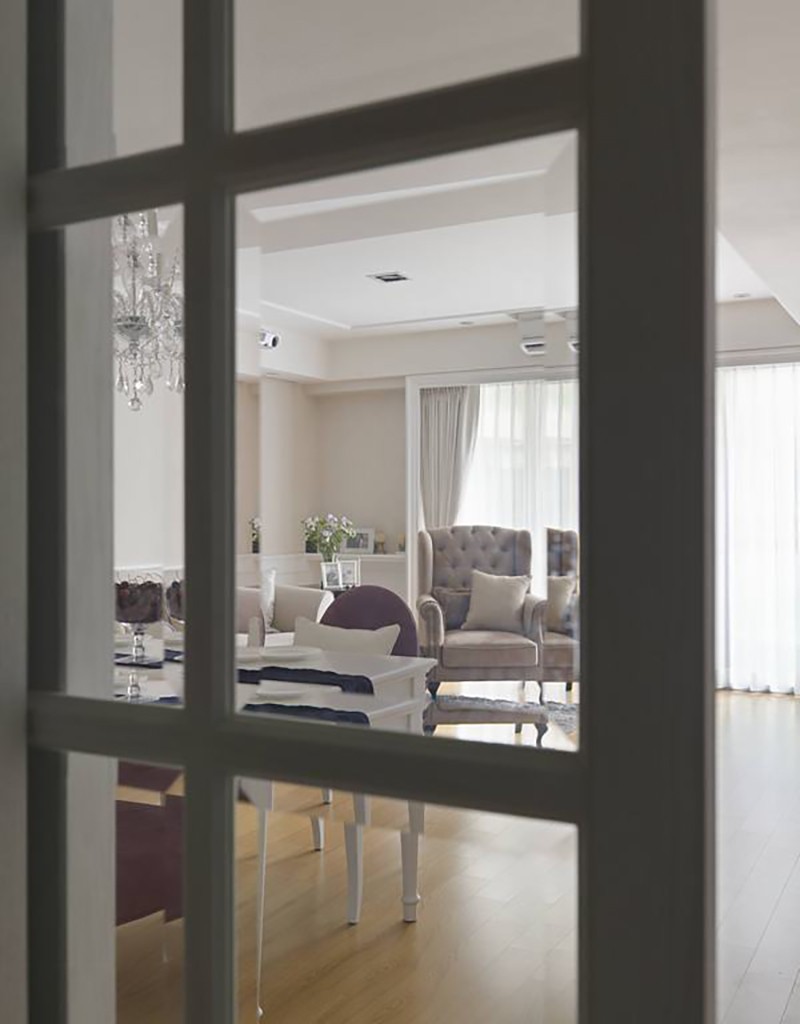 為了修飾社區(qū)中鋁框的不協(xié)調(diào),利用白色古典窗框佐以經(jīng)典白紗與窗簾,完整客廳古典情調(diào)。